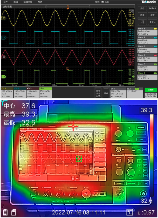 四,示波器的存储深度设置到最大时允许的最大采样率的情况下烤机6小时的测量值及示波器A面B面温度情况;