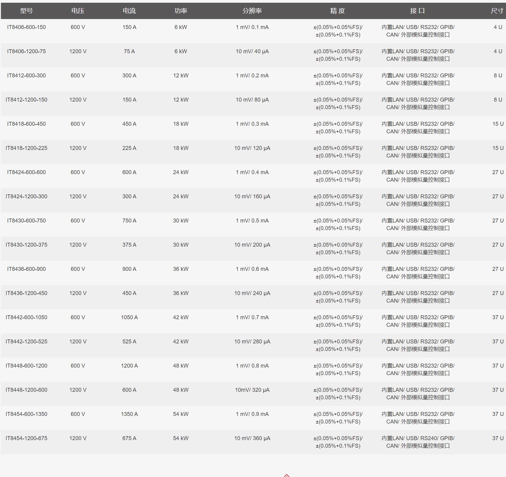 IT8400全系列标配三段式电流量程,比如1200V,6kW机型支持1.5A的电流量程,高达40uA的分辨率和1.5mA的测量精度。