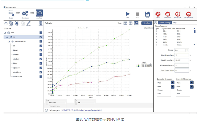 4200A-SCS系统提供的标配软件Clarius包括一组用于WLR测试的项目。这些项目包括一个具有可配置的测试级和项目级的应力测量循环,以及一个用于在晶圆上每个site上进行测试的循环项目。图3显示了HCI范例项目。该图显示了某一个特定的参数随时间推移而被测试,每个点代表一个应力周期后不同的测量。左边的窗口是测试序列,显示了测试的顺序和项目的整体结构。在Clarius项目库中中有几个用于WLR测试的项目,包括 :