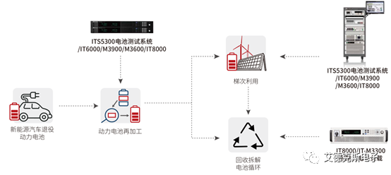 艾德克斯电池回收测试方案可以帮助用户解决包括退役动力电池从再加工筛选初期,至梯次利用,以及最终进入回收拆解,电池循环的全周期测试。