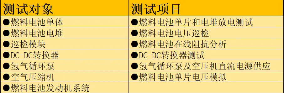 燃料电池电堆 在线阻抗分析、单片电压巡检、极化特性曲线测试、动态工况测试、额定/峰值功率测试、电堆耐久性测试 等,燃料电池极化特性表现了燃料电池输出电压随着电流的增加而逐渐降低的过程,极端条件下燃料电池输出电压可能为0V,为了保证负载两端的最小操作电压,可采用回路中串联升压电源的方式实现测试;满足燃料电池发动机系统 起动/稳态特性测试、动态响应/循环工况测试、额定/峰值功率测试 等,起动/稳态特性测试模拟真实车载条件下的耐久性问题,同时在实验中对道路工况进行仿真,包含怠速,加速,减速和迅速行驶等过程;满足 DC-DC输入输出特性测试、峰值功率及持续时间测试、循环工况曲线测试、动态响应测试 等,DC-DC模块的输入特性综合考虑电堆的极化特性、系统效率、低温冷启动以及电堆残余电压的泄放等问题。