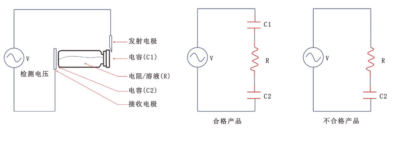下图中,包装容器的两端分别连接有发射极和接收极两个电极,C1和C2分别代表发射电极与容器溶液之间、接收电 极与容器溶液之间所形成的电容(由于容器外壁的绝缘的阻隔,电极无法与溶液接触,故形成电容),Z1和Z2分别代表 C1和C2所产生的容抗,R代表溶液本身的电阻值。 依据欧姆定律方程如下:I=V/(Z1+R+Z2) 当包装容器完好,没有泄漏时,检测回路如上图2产生感应微电流I1,即为I1=V/(Z1+R+Z2)。 当包装容器泄漏时,是容器外壁与电极之间形成的电容消失,即为击穿,使电容所产生的容抗为零,此时检测回路中 产生的感应微电流为I2,即为I2=V/(R+Z2)。 判断包装容器泄漏与否,取决于检测回路中所测得的电流,电流的差异△I,即:△I=I2-I1作为容器合格与否的判别标准。